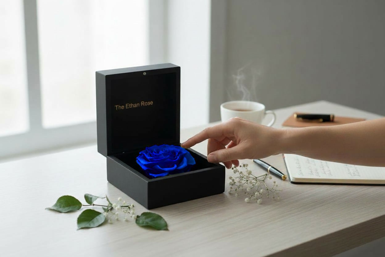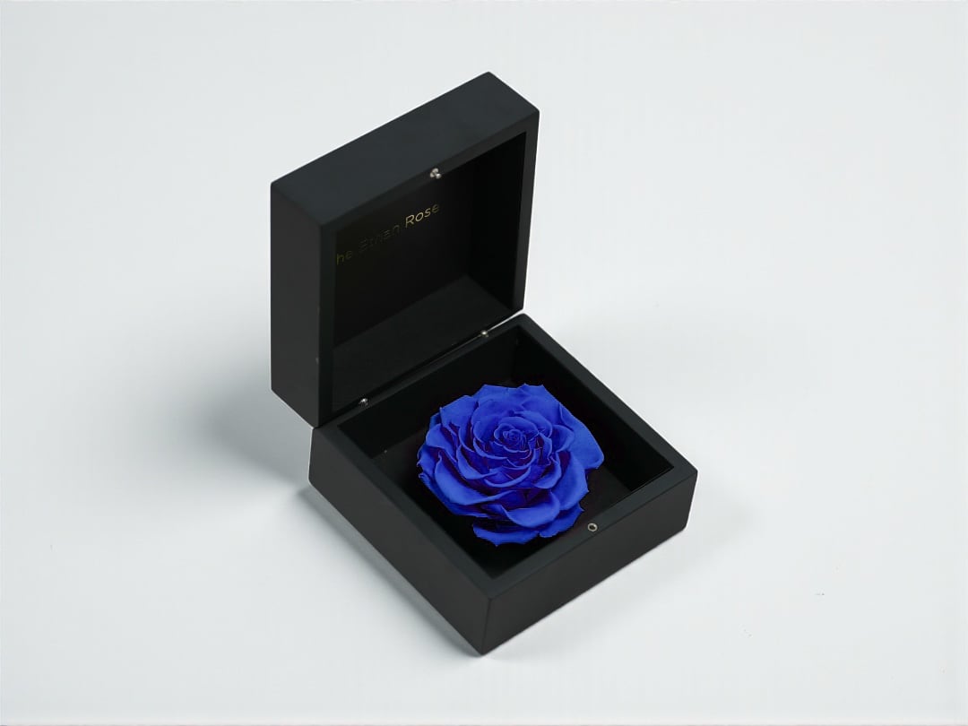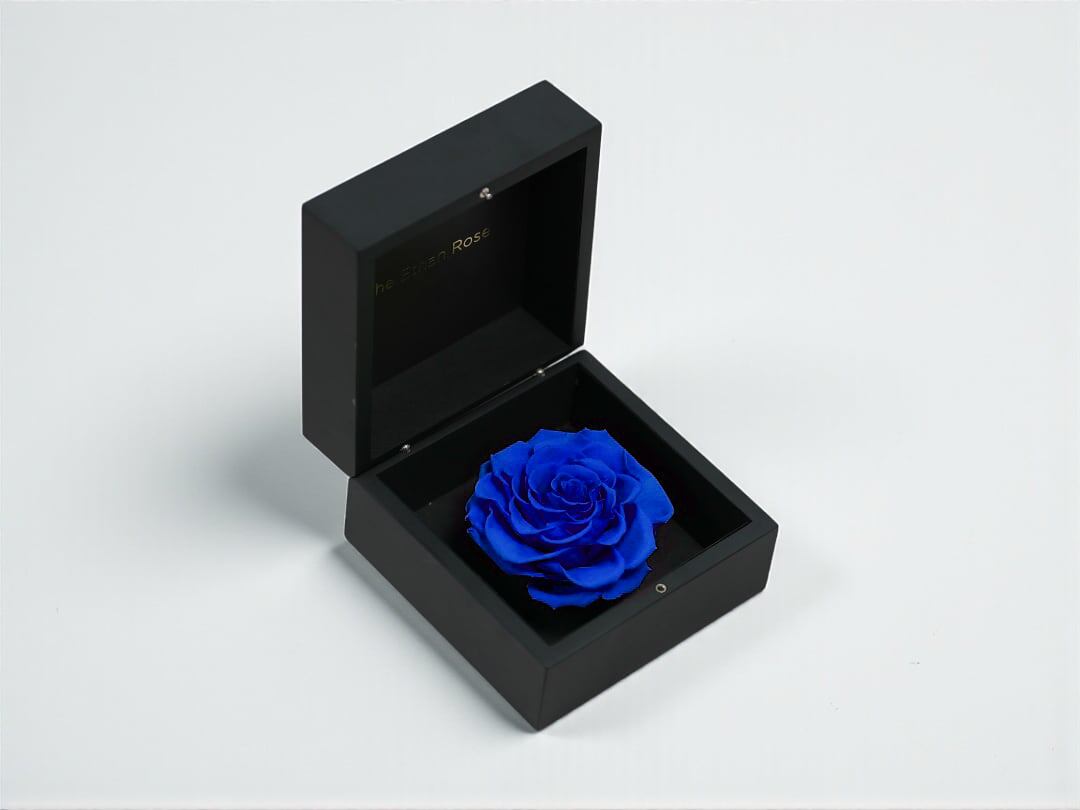 深いブルーの輝きを、一輪だけ丁寧に収めた上質なギフトボックス。