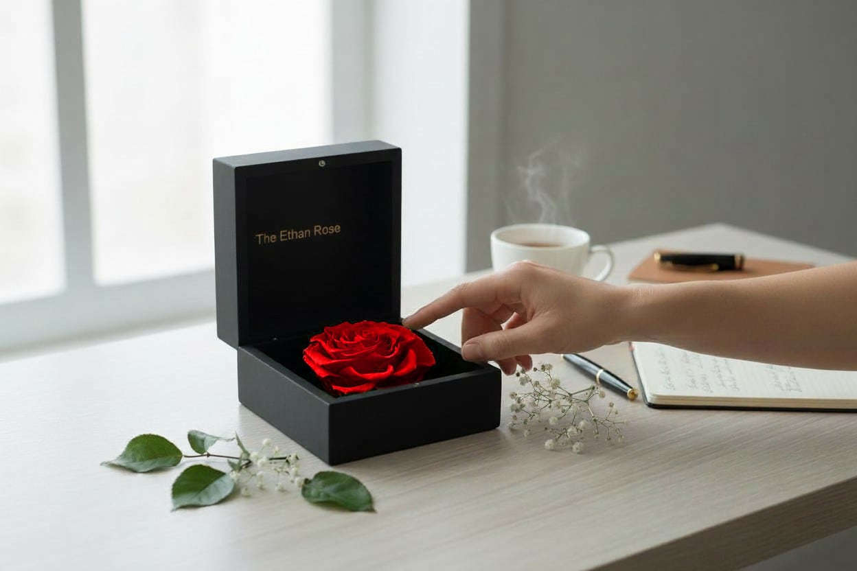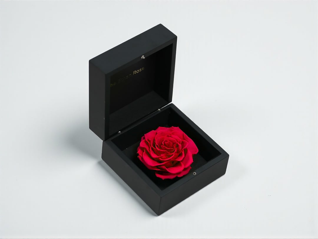 深紅のローズを、一輪だけそっと閉じ込めた上質なギフトボックス。