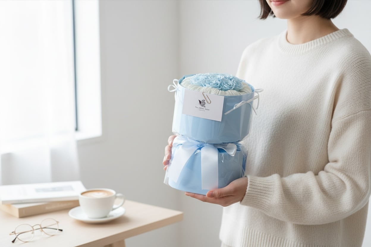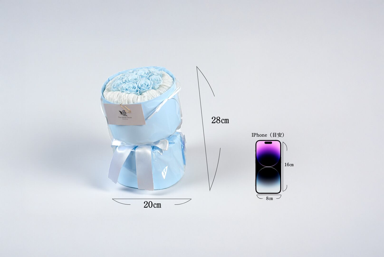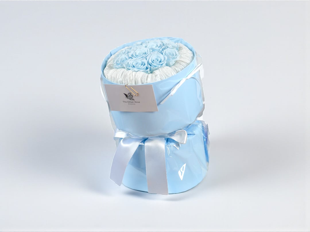 ふんわり淡い水色が可愛さを引き立てる、人気のローズギフト。
