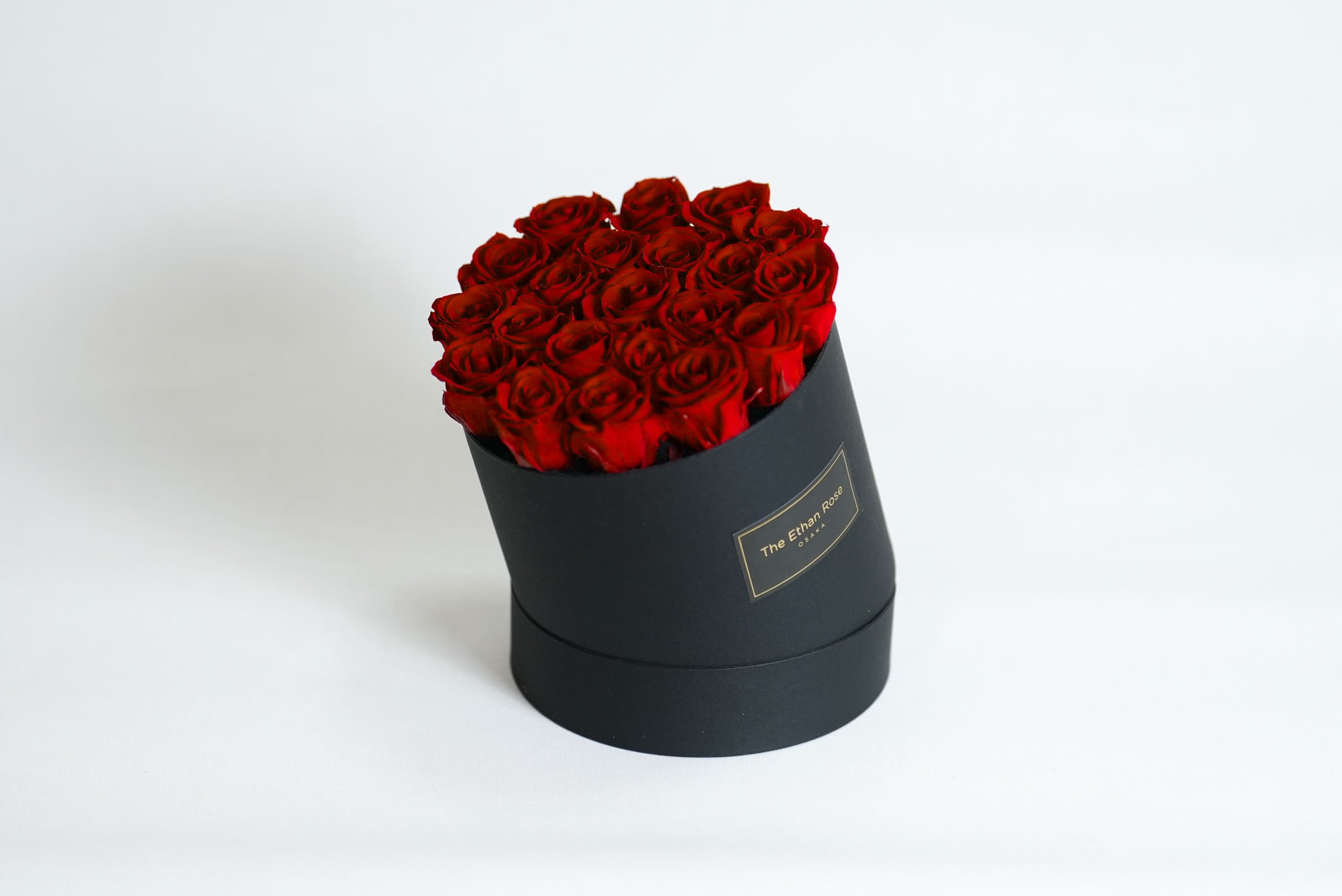 赤いローズを21本使用した、大人のためのローズボックスギフト。