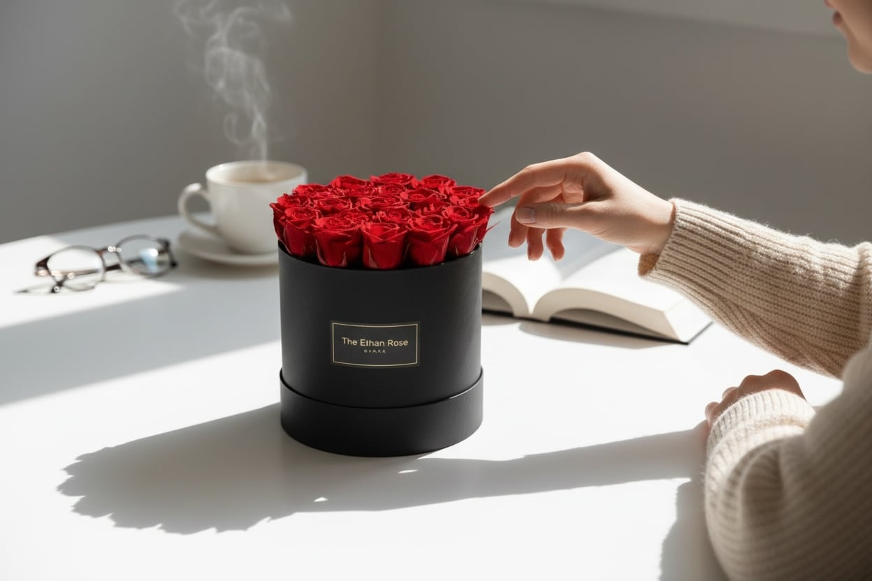 深みのある赤いローズと、洗練されたブラックボックスが、