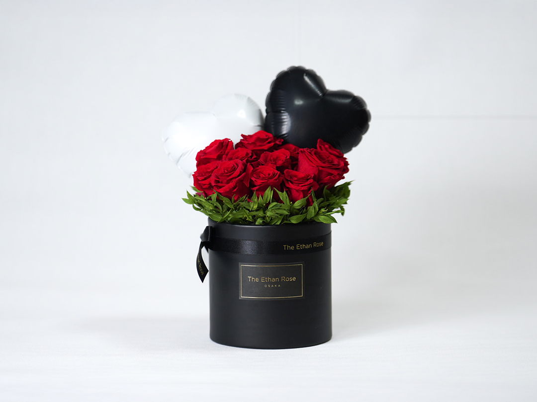 赤いローズと洗練されたモノトーンデザインが、さりげなく特別感を演出。