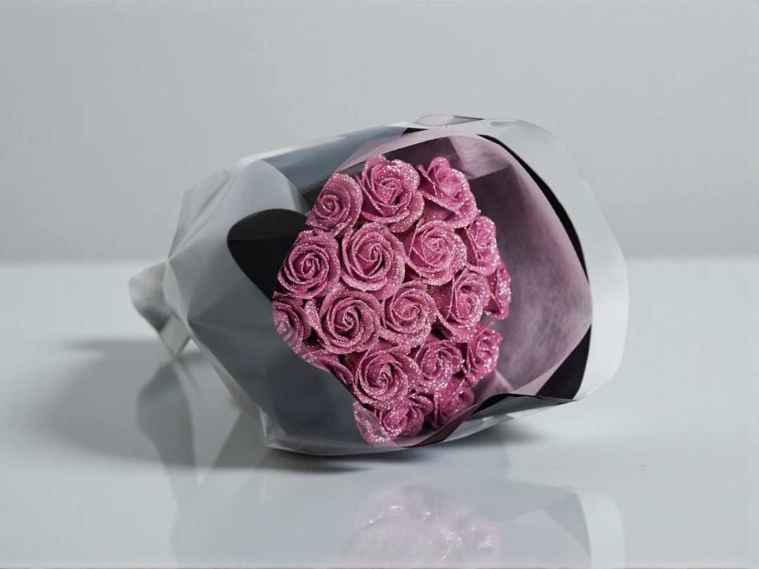 グリッター加工を施したピンクのソープフラワーを19本束ねた、華やかなローズブーケ。