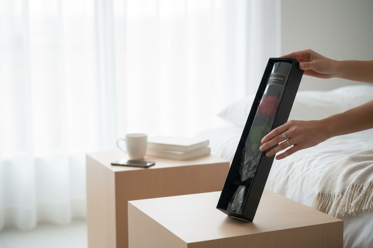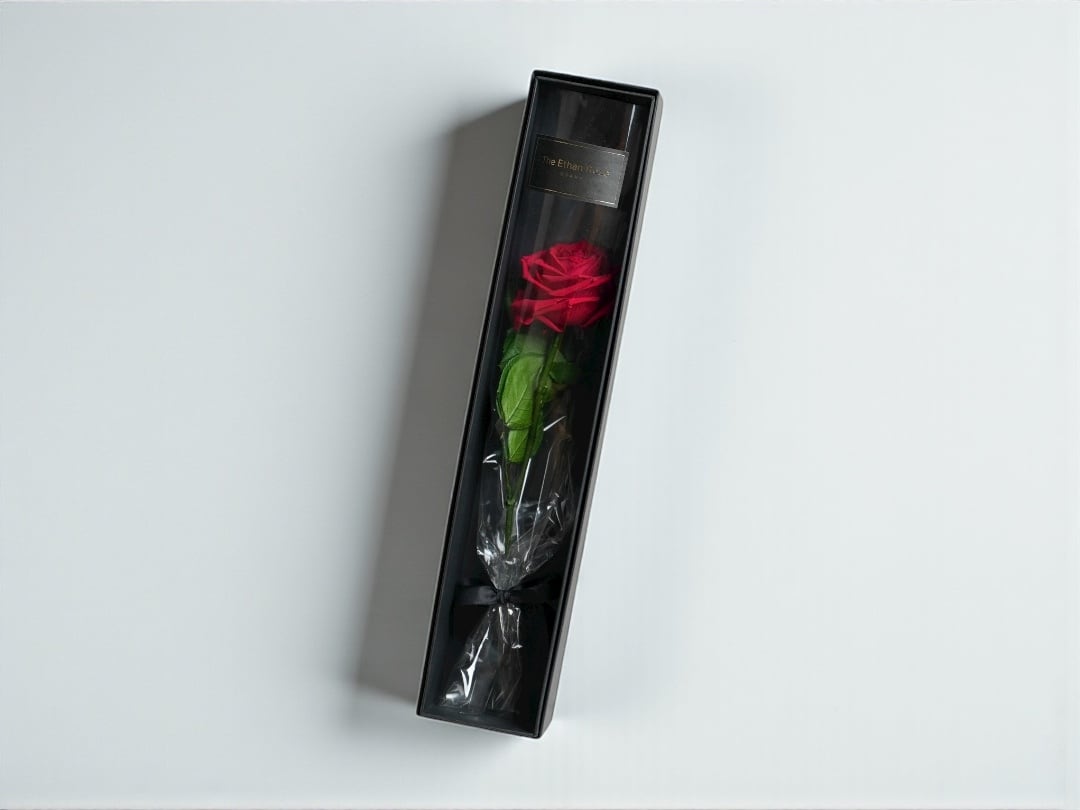 一輪の赤いローズを、スリムで洗練されたボックスに収めた